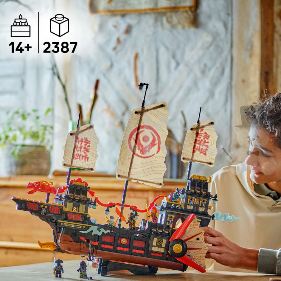 Tento velký model lodi se může pyšnit pohyblivými plachtami, odnímatelnými střechami a podlahami, které umožňují přístup do interiéru, včetně sushi baru a tajného počítače. Děti si mohou hrát na scénáře z oblíbeného televizního seriálu JINJAGO a využít různých interaktivních prvků k obohacení svého zážitku z hraní.